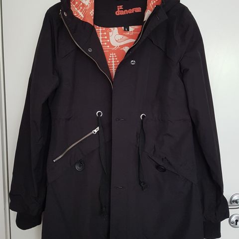 Danefæ halvlang vandafvisende overgangs jakke. Mørk grå. Så godt som ubrugt. Har både lynlås og trykknapper. Fast hætte. Ikke-ryger hjem. Sender gerne, køber betaler forsendelsen.
