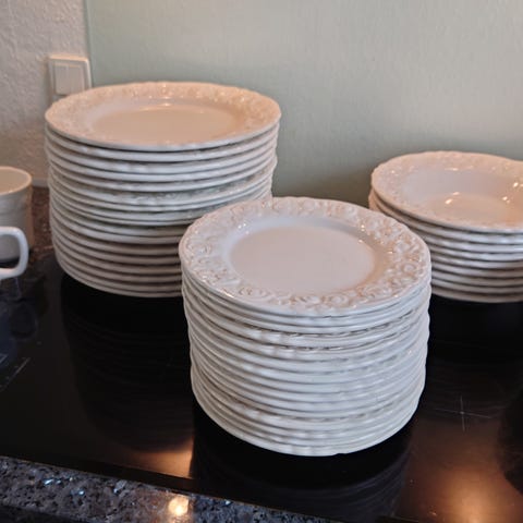 14 kopper, 16 underkopper, 15 desserttallerkner, sukker og fløde, 4 lysestager, 1 vase, 1 fad, kartoffelskræller, 2 sovsekande, 15 dybe tallerkner og 13 flade tallerkner, 5 askebæger og 2 mikro skåle