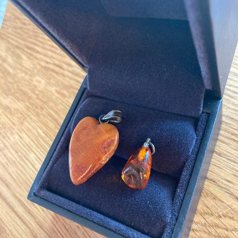 2 vedhæng i Rav. Hjerte måler 2,5 og det andet 3,5. Sender gerne med Dao.