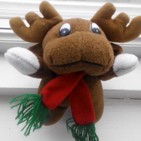 Stor rød ko med fødselsdags flag og dannebrog på træpind.