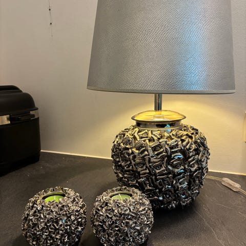 Flot sølv farvet sæt bestående af bordlampe og 3 lysestager.