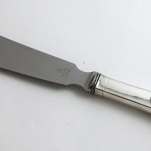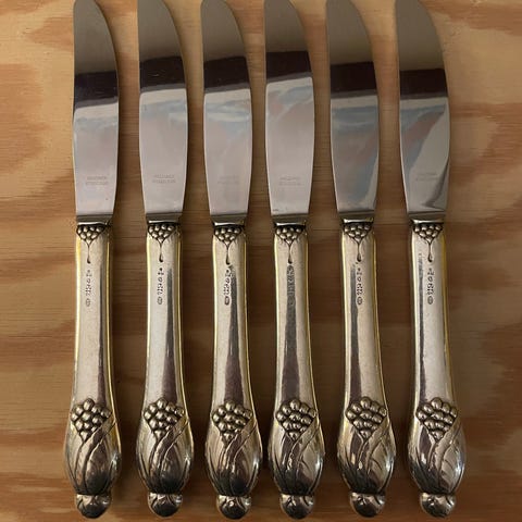 Evald Nielsen nr 32 knive tretårnet sølv, Tretårnet sølv, 100 år gl., Evald Nielsen knive. 4 stk 22 cm. Vægt 75 g/stk incl knivblad Tretårnet sølv og ingen gravering. Alm brugsspor. 200 kr/stk.