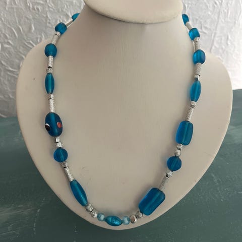 Halskæde med lyseblå glassten.