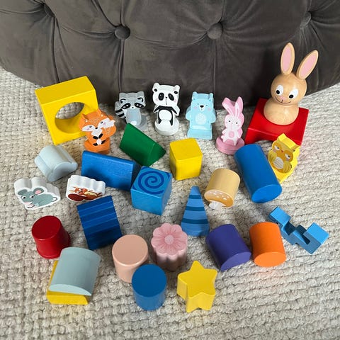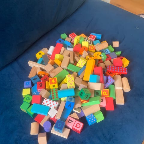 En stor mængde træklodser og en put i hul kasse. Passer vel til 1-3 årige