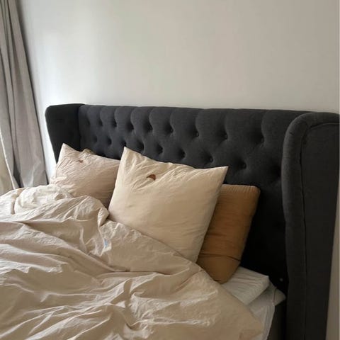 Marine blå sengegavl med knapper. Passer til standard seng i størrelsen 180x200cm og kan bruges som dekorativ og funktionel tilføjelse til soveværelset. Beslag til ophæng på væg medfølger.
