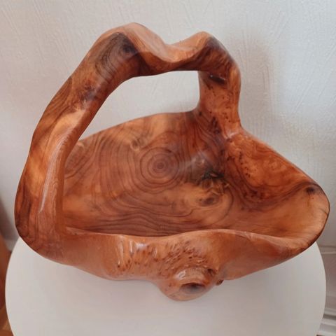 1 Stk. Oval kurv med flettet sider og justerbare håndtag. I lyst træ. Fra La Vida. Fra nu lukket butik. Faktura haves.