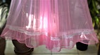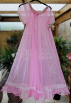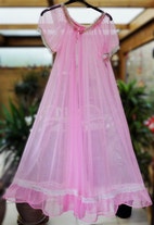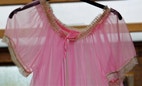Lyserødt peignoirsæt i størrelse M. Materialet fremstår let og gennemsigtigt med detaljer ved halsudskæringen og kanten. Meget lækkert og utroligt sexet!