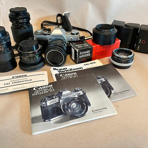 Canon AE-1 spejlreflekskamera med manuel betjening og udskifteligt objektiv. Medfølgende Vivitar 70-210mm f/4.5 makro zoomobjektiv med 62mm filterstørrelse. Objektivet har zoomfunktion og makroindstilling, egnet til forskellige fotograferingssituationer. filter og læder taske til linsen medfølger. super kamera