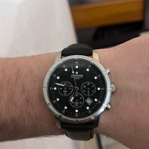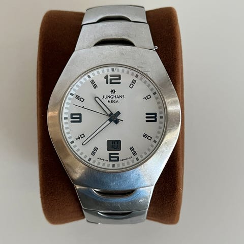 Herrearmbåndsur Junghans - Tyskland, manuelt optræk, 17 juveler, stål, metalskive med delvist forgyldte timemarkører og guldbelagte visere, D.ca.30mm.