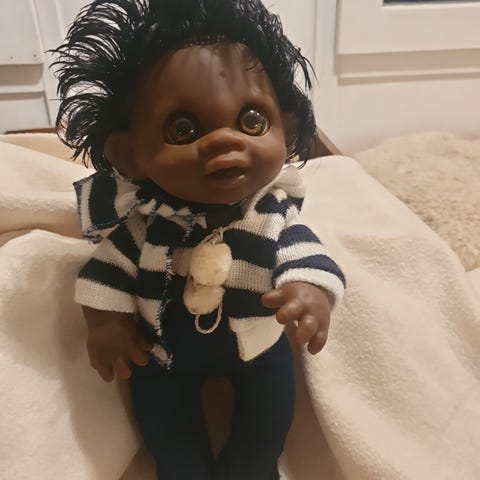 Original DAM Troll Dukke i fodboldspillerudgave Skolefodbold 2017/2018 med rød og hvid dragt. Fremstillet i plastik med bløde detaljer, mærket "DAM DANMARK 1984" på foden. Dukken har sort hår og holder en lille fodbold.