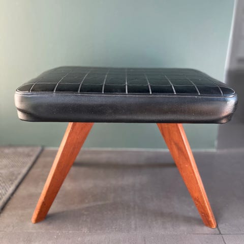 Der er revne i skindet (jeg tænker, det kan limes) samt skruehuller efter tidligere placering af stellet.