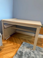 Flexa børnemøbler bestående af et bord og en opbevaringsbænk i grå træ. Bordet har en flad overflade til aktiviteter og opbevaringsbænken har låg, der kan åbnes for opbevaring. Møblerne er designet til børn og er lavet af træmateriale i en neutral grå farve.