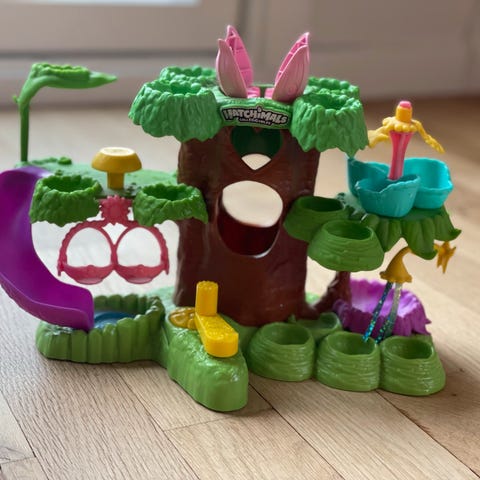 Hus-delene kan sættes sammen på forskellig vis. Dreje- og vippen mekanisme på playsettet. Figurene er magnetiske og kan rulle ned ad rutchebanen.