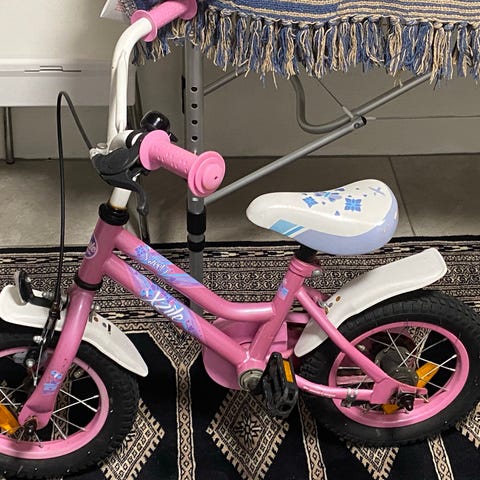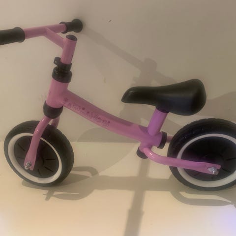 Puky Løbecykel med rød ramme og gule hjul, størrelse 12 tommer. Cyklen er designet til børn og har et lavt trinbræt for nem adgang. Materialet er metal med plastdetaljer. Cyklen har et håndtag med gummi og en ringeklokke med motiv fra Cars.