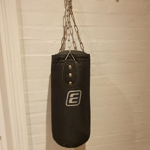 Sandsæk boksepude, ca. 40 cm. bredde 80 cm. højde, som ny, stor, tung, sort, rigtigt godt solidt ophæng, kender ikke vægt men gætter på ca. 20-25 kg.