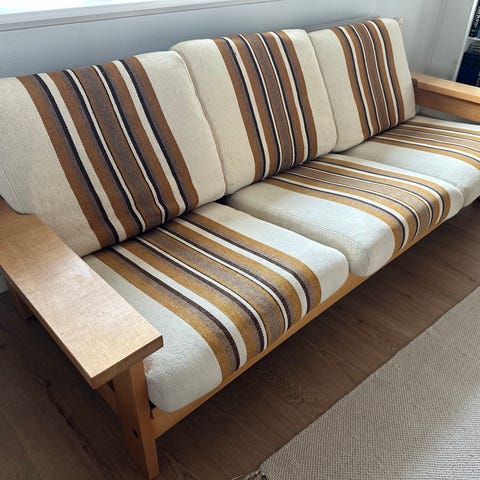 Sofaen er bygget med en robust ramme i massivt egetræ med puder i 100% uldstof, Narvik stof i beige med tynd hvid stribe.