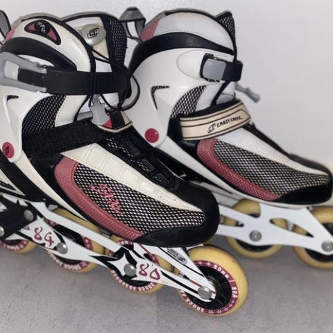Rulleskøjter i størrelse 38 med sort quiltet lædermateriale. Designet til rulleskøjteløb med snørelukning og hjul til udendørs brug.