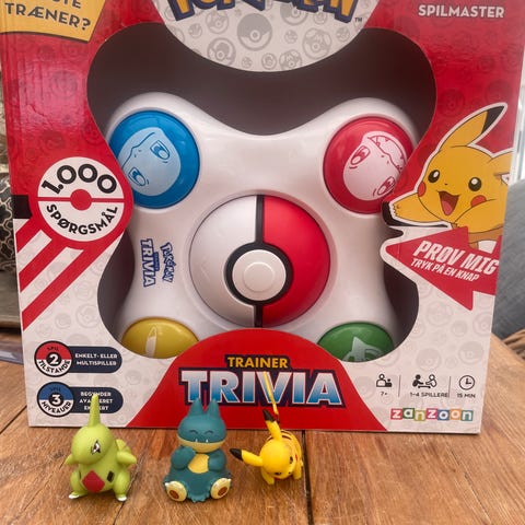 Pokémon Trainer Trivia spil med fire farvede knapper (rød, grøn, blå, gul). Spillet er designet til at teste viden om Pokémon og inkluderer en brugervejledning. Passer til børn og fans af Pokémon-serien.