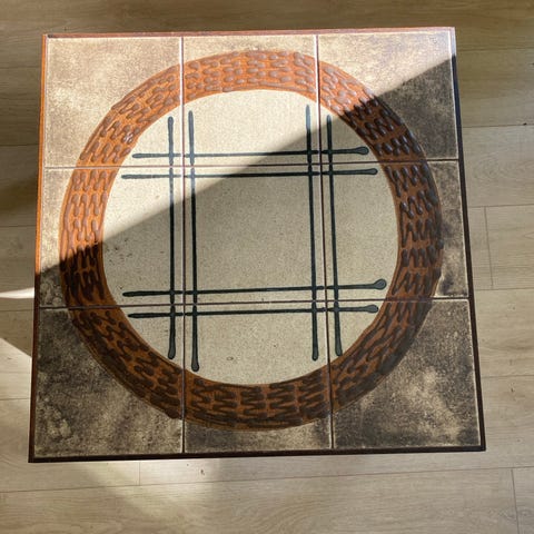 3 små borde / sofaborde / natborde / sidebordet med kakler i offwhite og med dekoration i orange og brune nuancer.