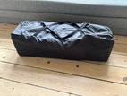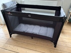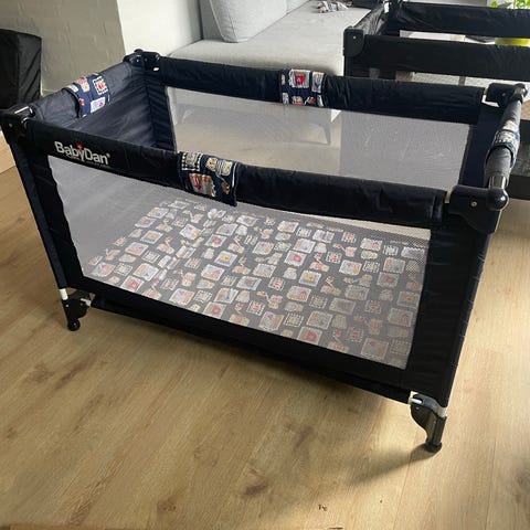 BabyDan Rejseseng er en bærbar børneseng med sort farve og net på siderne for ventilation og overblik. Sengen er designet til nem transport og opbevaring, leveres med en medfølgende taske til transport.