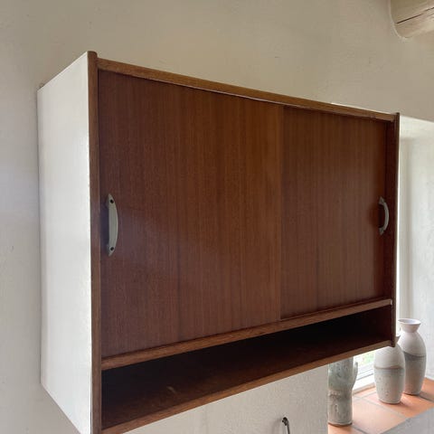 Super fede teaktræs skab til at hænge op på væggen. der er 1 nøgle med som kan låses skabet. den nederste hylde kan tages af og ligge i båden af skabet.