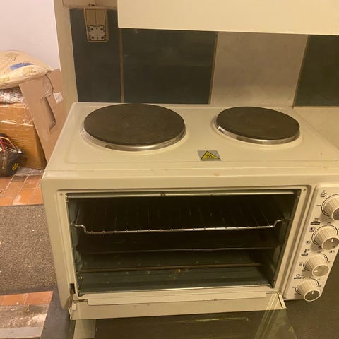En kasse med forskellige køkkenmaskiner, ur, lampe og mini ovn.