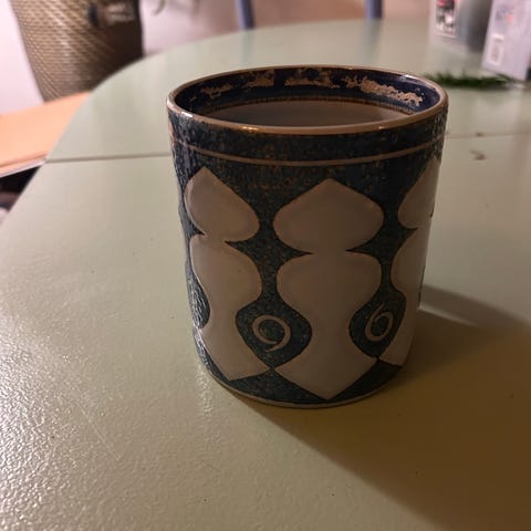 Royal Copenhagen 1972 krus i blå og hvid porcelæn. Kruset har et dekorativt mønster og leveres med original blå æske fra Den Kongelige Porcelænsfabrik. Velegnet til daglig brug eller samling.
