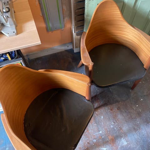 Disse to smukke kunstværker er designet af Klaus Wettergren i 1980’erne. Modellen kaldes ‘Siddende Skulptur’, hvilket er en yderst rammende beskrivelse. Stolene er skulpturelle mesterværker med stel i grålakeret metal, sort lakeret og ryg i elmerod. Sætpris