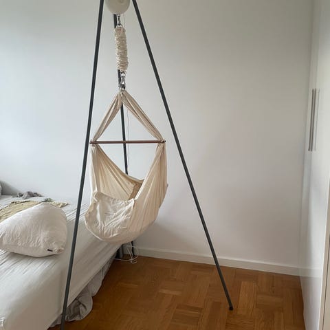 Moonboon slyngevugge med motor og stativ sælges. Det hele er fra Moonboon.