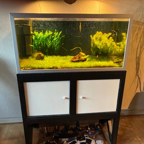 Aqualine akvarium, 240 liter, med hvidt skab. Akvariet er rektangulært med glas på sider og front samt aluminiumsfarvet ramme. Øverst er der låg med indbygget lysarmatur. Akvariet står på et fritstående, hvidt skab, som fungerer som sokkel med en plade under. Bunden er fyldt med grus, som kan bruges som bundlag til fisk eller planter. Velegnet som indendørs akvarium til ferskvands- eller saltvandsopsætning afhængigt af øvrigt udstyr og indretning.