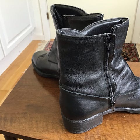 Støvler i størrelse 36 lavet af sort læder. Støvlerne har en knapdetalje ved ankel og en lynlås langs siden for nem adgang. Designet til kvinder med en klassisk og enkel stil.