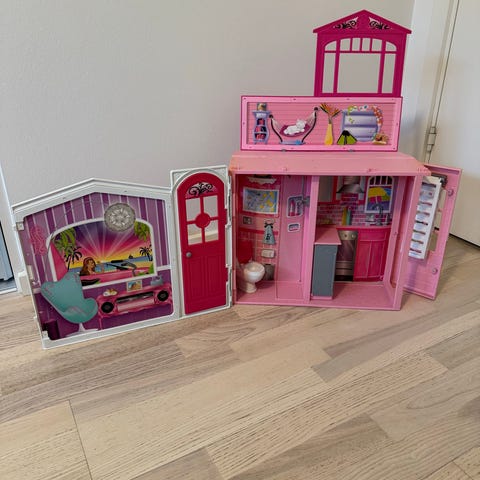 Barbie legetøjssæt bestående af et legehus med flere etager og tilhørende køretøjer, herunder en rød madvogn og en lyserød bil. Legehuset er udstyret med trapper, elevator og forskellige rum. Køretøjerne har åbne døre og aftagelige dele. Sættet er fremstillet i plastik og er designet til børn.