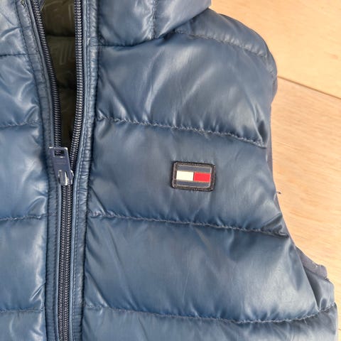 Rigtig fin Hilfiger dunvest i str. 140. Kan vendes. Mørkeblå på den ene side og grøn m logoer på den anden side.