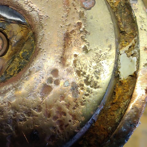 Kæmpe og gedigent 4 kg. messingaskebæger med torpedoformet cigarklipper. Bunden fra stort granathylster, rigt stemplet med flere marinestempler med ørn, 20,5 cm Ø, 5 cm højt. God stand.