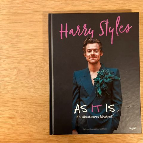 Harry Styles As It Is illustreret biografi i fin stand. Bogen indeholder billeder og tekst, der detaljerer Harry Styles' liv og karriere. Den er på dansk og giver en visuel og informativ gennemgang af hans musik og personlige historie.