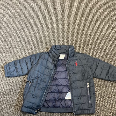 Jakke har høy hals. Dynejakken er vattert med polyester stof.