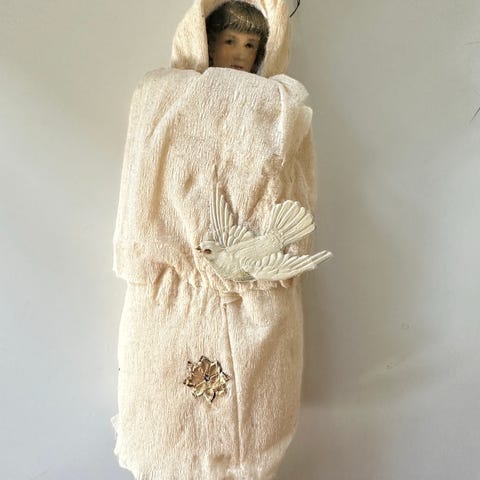 Antik vatpynt til juletræet, Sød lille gammel pige i var med crepenederdel og jakke i vat og L&B oblat. Hun måler 11 cm og sendes for kr. 45