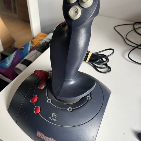 Logitech Attack 3 joystick med kablet USB-forbindelse. Sort farve, designet til spilkontrol med flere knapper og justerbar håndgreb.