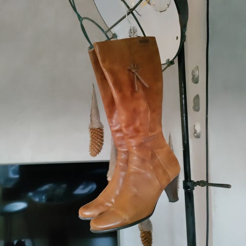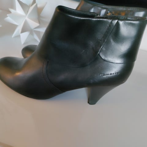 Støvle med leopardprint i sort og med meget lidt shine. Hælhøjde 10 cm. Fremstår næsten som ny, da den kun er brugt en gang. Ingen synlige brugsspor.