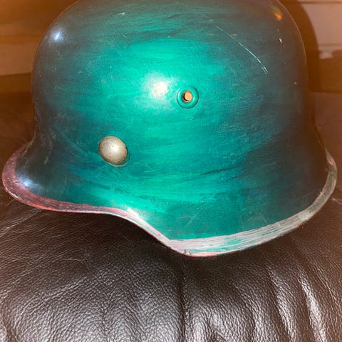 Hjelmen har en klassisk form og viser tydelige tegn på brug med buler og slid.
