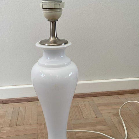 Holmegaard bordlampe i hvidt glas. Lampen har en klassisk form og er egnet til brug som dekorativ belysning i hjemmet. Materialet er glas. Måler 50cm.