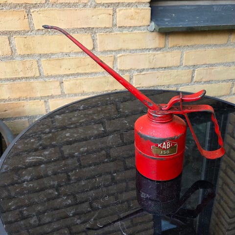 KABI oliekande med pensel, kapacitet 250 ml, rød metal. Egnet for påføring av olje eller smøremidler, udstyret med en integrert børste for præcis påføring. Ideel til smøring af hækkeklipper eller cykelkæder. Brugsspor, men virker perfekt.