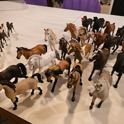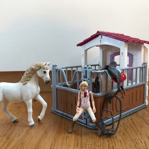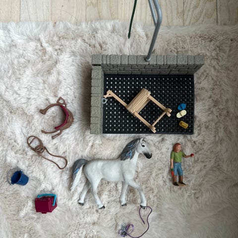 En lille samling af Schleich hest, boks og bad.