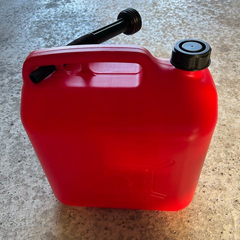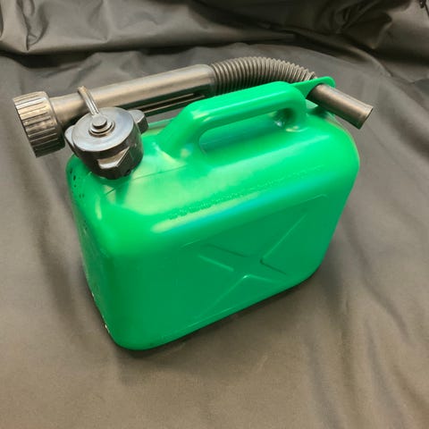 Sort plast brændstofdunk med gul fleksibel tud. Designet til opbevaring og transport af brændstof. Praktisk håndtag til nem bæring. Passer til forskellige typer brændstof og anvendelser. Skal afhentes.