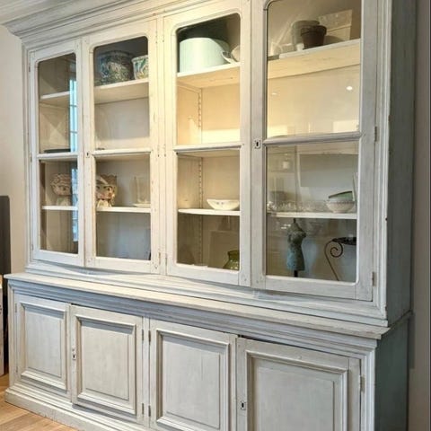 Super flot, elegant og praktisk antik/ gammelt Gustaviansk vitrineskab i hvid med to glaslåger m/ nøgle opdelt i ruder og en skuffe nederst. Skabet er lavet i træ og har en klassisk, enkel stil med smukke sprossede ruder og 5 hylder. Velegnet til opbevaring og fremvisning af glas, service, dekorative genstande, mm. Også smuk med en kurv under.
