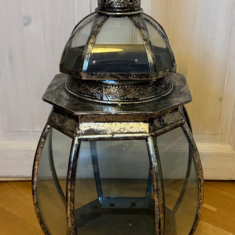 Smuk og stor lanterne i metal med glasruder. Solid og halvtung. Med fine detaljer.