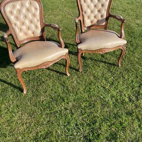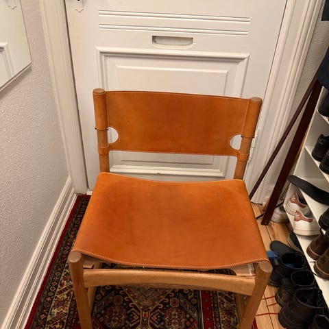 Jubilæumsmodellen af den spanske stol i egetræ og med armygrønt læder søges.