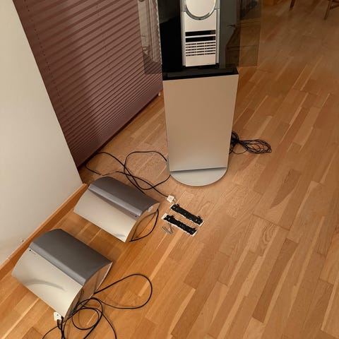 Bang & Olufsen Stereopakker bestående af flere enheder inklusive højttalere, fjernbetjening og tilhørende kabler. Systemet er designet til at levere lyd i stereoformat og kan anvendes til musikafspilning i hjemmet.
