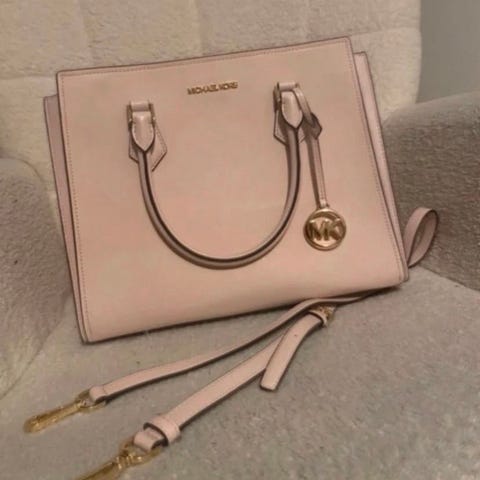 Michael Kors stof taske til kvinder i beige med brune detaljer. Tasken har to håndtag og en lang justerbar skulderrem. Den har flere lommer indvendigt, herunder en lynlåslomme, og lukkes med lynlås. Designet inkluderer Michael Kors logo og en dekorativ kvast.