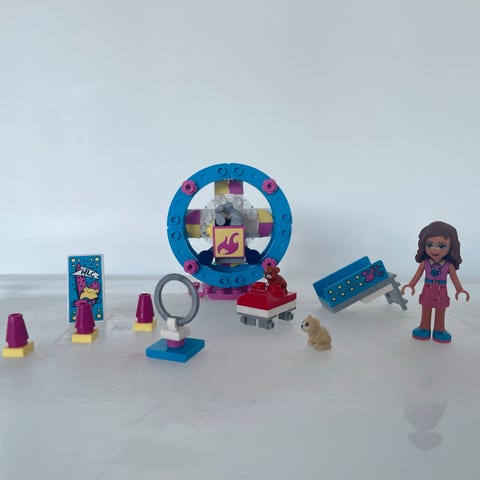 LEGO Friends legetøjssæt indeholder en lille figur, flere tilbehørsdele som kager, en kuffert, og forskellige små genstande. Sættet har farver i blå, pink og rød, og er designet til børn. Materialet er plastik, som er standard for LEGO produkter.